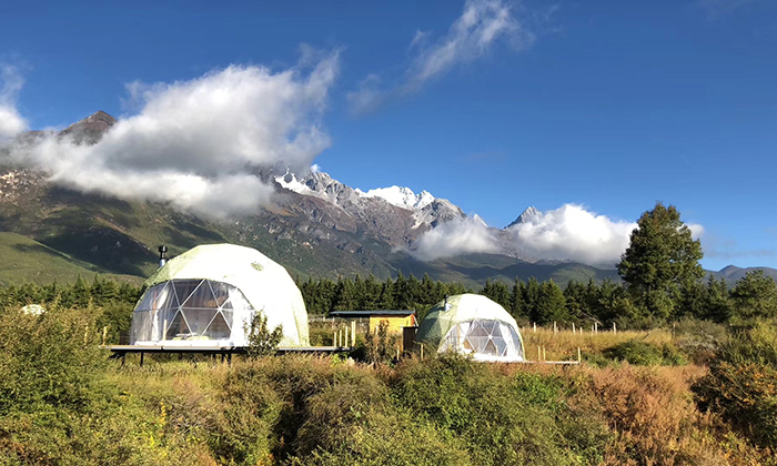 這款產品是天幕小屋家庭款,產品戶型是標準間,外部面積:72 ㎡,內部面積:38 ㎡,外部尺寸:8*9 m ,內部尺寸: 4.5*8.5m,主體高度:3.7 m ,墻面高度:2.2 m,防風等級:8 級。