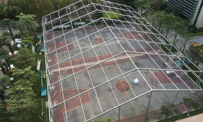 籃球場篷房的搭建需要考慮到多個要素,包括篷房面積、高度、類型、結構框架、篷布類型等方面。在篷房結構材料的選擇中也需要考慮到其結構的穩定性,同時需要注意篷房的防水性能。
