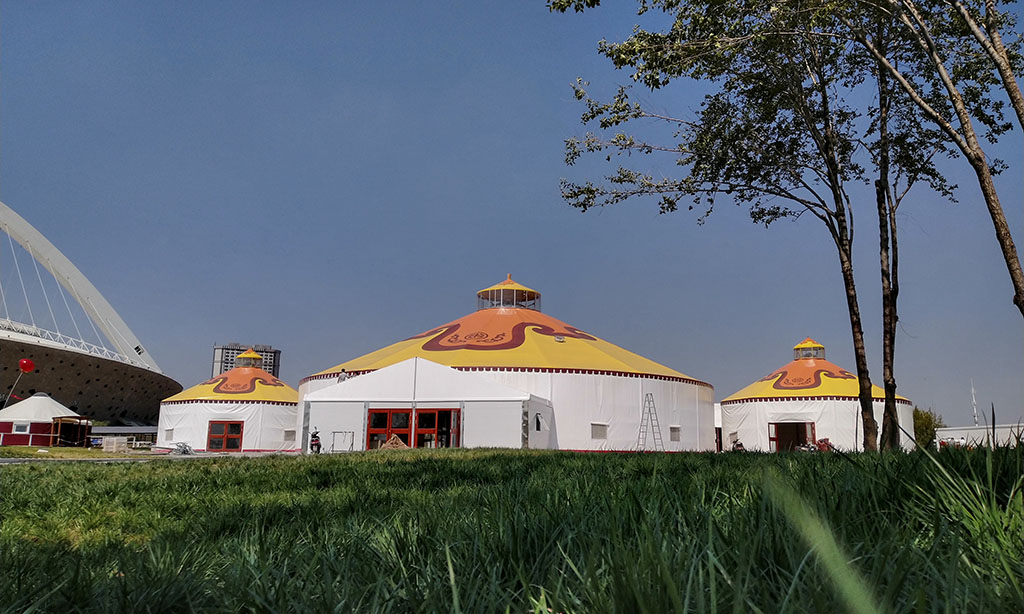 蒙古包篷房的定制尺寸一般在5-30米之間,支架一般采用高強度航空鋁合金,篷布采用750-900克每平方米的pvc刀刮涂層合成纖維布,顏色可根據客戶需要定制。配置方面:洗手間隔斷、保溫棉、衛浴、家具、家電等等。該篷房可用于特色野奢帳篷住宿、休閑旅游特色餐廳、園林景觀休息室、特色產品展廳等等。