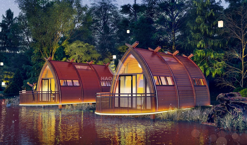 施工的過程也是最大限度的減少對環境的破壞,結構構件由工廠預制后再現場組裝,船屋主體由插入地下中的金屬管樁提供支撐。施工現場無濕作業無揚塵,清潔簡單高效,是保護生態環境的最佳建造方式。