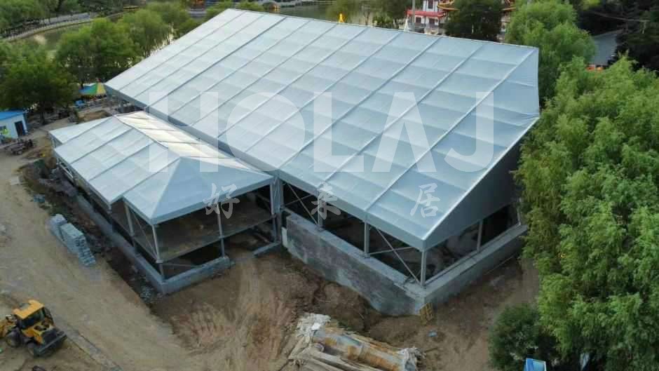 好來居篷房采用坡屋面鋁合金篷房結(jié)構(gòu)形式搭建了40*55*3.3異形主體篷房和10*25*3.3入口門廊,對考古現(xiàn)場進(jìn)行覆蓋保護(hù)。建筑形式為裝配式人字頂篷房,由若干鋁合金管材和鋼結(jié)構(gòu)節(jié)點板拼接成骨架,外面罩以膜材形成。